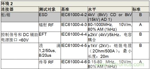TI工程師測試IEC61800-3標準來獲取環境規範(表1)。該設計使用鎧裝連接器和鎧裝電纜(長度>30m)。標準的定義見表2。