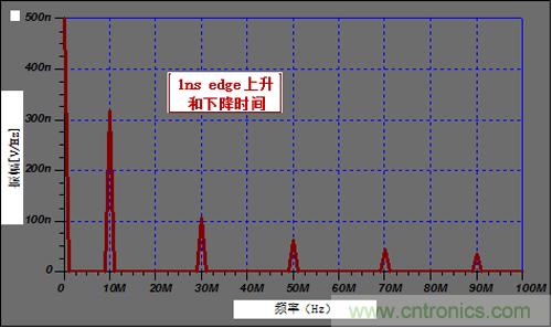 根據該公式,10nsEdge Rate對應的諧波頻率大約為31.8MHz。圖3顯示:最後一個重要的諧波頻率為30MHZ。同時,1ns的Edge Rate對應的諧波頻率318MHZ(圖2)。如果頻率範圍擴展到300MHZ以外,顯示的諧波仍很明顯,但卻在相關頻率上迅速變小。
