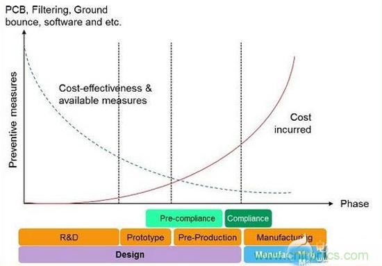 圖1:當產品在開發階段一步步推進時,變更所承擔的潛在成本上升,清除EMI問題的可用措施逐步受到限製。
