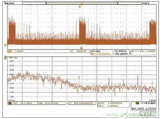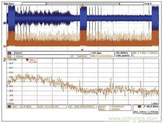 然而,混合域示波器(MDO)的推出使情況有了改觀,它能提供同步的而且與時間相關聯的觀察和測量功能。如圖5所示的這種儀器能夠相當容易地讓我們觀察哪個信號與哪個EMI事件同時發生,從而可以簡化EMI排查過程。