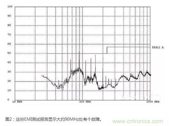 請看圖2所示的EMI測試報告,這份報告顯示大約90MHz處有個故障。