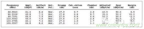 圖3是對應的列表數據報告,其中詳細列出了測試頻率、測量得到的幅度、校準後的校正因子以及調整後的場強。然後將調整後的場強與下一欄中的指標進行比較,確定餘量或超額量,顯示在最右欄。