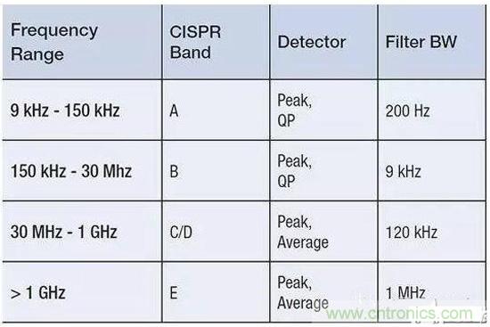 表1:CISPR測試要求根據不同頻率範圍而有所變化,並影響頻率分辨率。