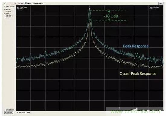 好消息是,峰值和準峰值掃描對預先一致性測試來說仍然是有用的。圖4給出了一個峰值和準峰值檢測的例子。圖中顯示了峰值檢測和準峰值檢測中都能看到的脈寬為8μs、重複率為10ms的信號。結果準峰值的檢測結果比峰值低了10.1dB。