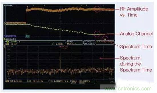 圖6:這張圖顯示了MDO提供的時間關聯觀察功能,圖中顯示了射頻幅度與時間的關係軌跡。