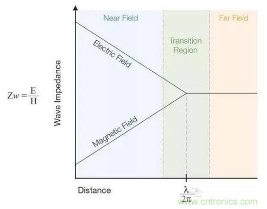 圖7:這張圖顯示了近場和遠場中的波阻行為以及兩者之間的過渡區。近場測量可用於EMI排查。