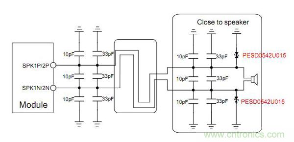 對於揚聲器的靜電保護,可以采用0402或0201的超低電容 ESD器件PESD0542U015,可以節約布板空間,且因為0.05PF的電容,可以保證此模擬信號的完整傳輸。