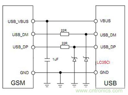 此模塊USB經常用來配置數據,插拔容易被靜電損壞,本方案可以采用分立器件或者集成器件,但要確保選擇的器件結電容小於3PF。