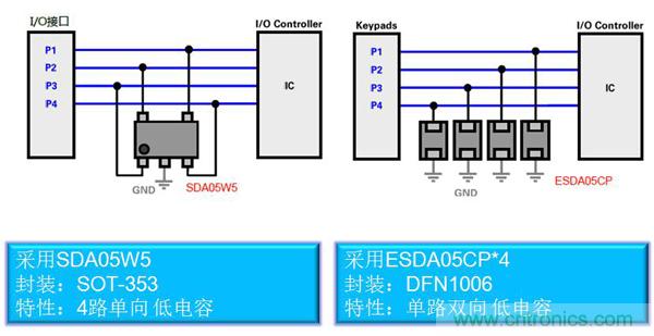 對於普通的IO口的靜電防護,因為其速率較低,采用普通的TVS器件即可滿足8KV的防護需求。