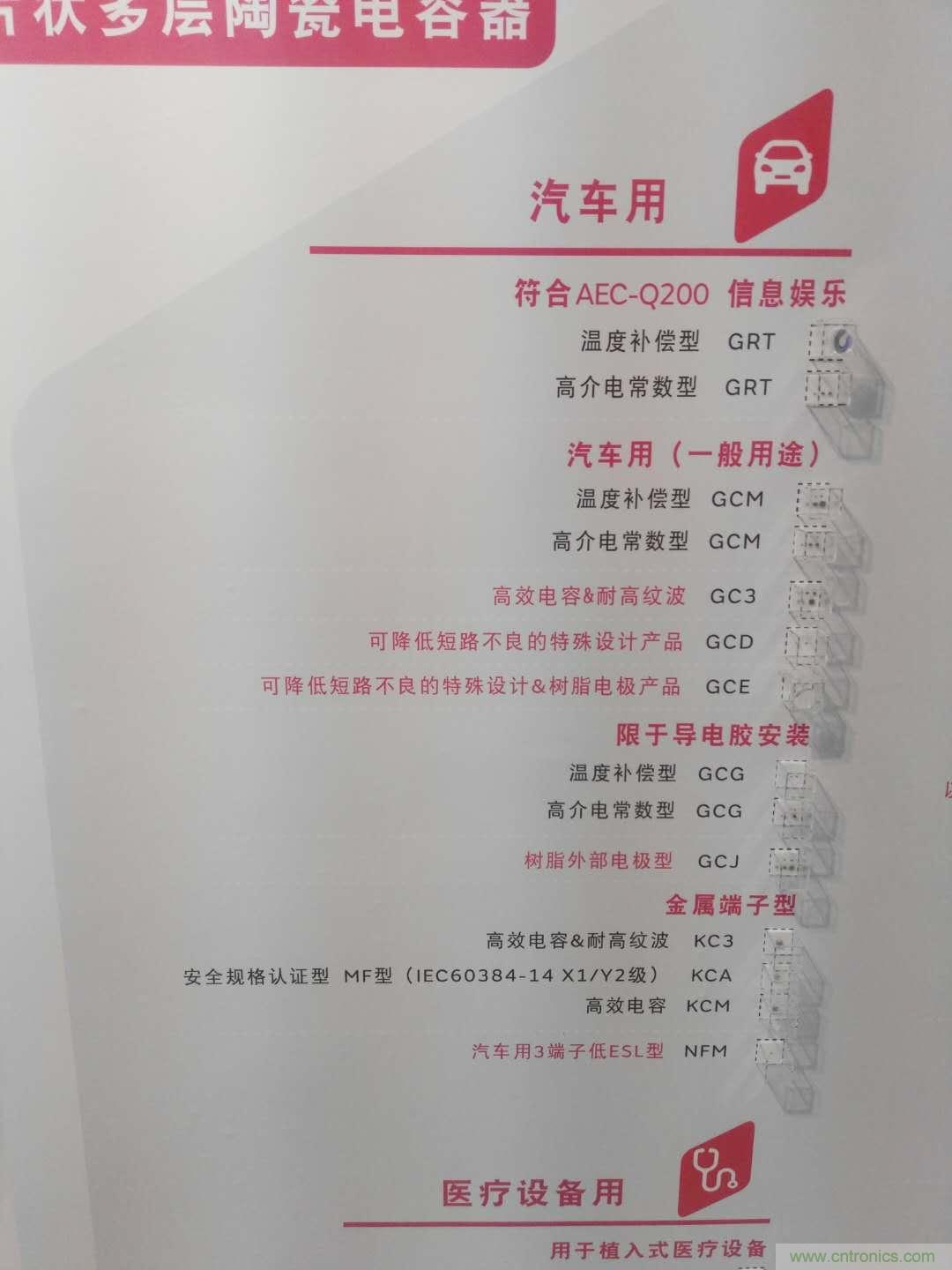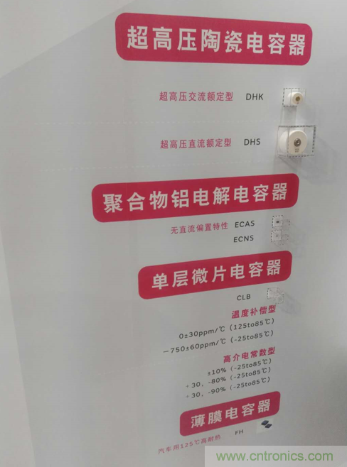 也許是由於近年來MLCC等電容器需求再次暴漲,村田在今年的展位上開始重新強調電容器這一傳統優勢產品,並在現場展示了包括MLCC、超高壓陶瓷電容器、聚合物鋁電解電容器、單層微片電容器、薄膜電容器等極其豐富的電容產品線。