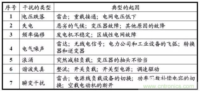 造成電磁幹擾複雜性(特別電源線幹擾的複雜性)的第二個原因是幹擾表現的形式很多,可以從持續期很短的尖峰幹擾直至電網完全失電。其中也包括了電壓的變化(如電壓跌落、浪湧和中斷)、頻率變化、波形失真(包括電壓和電流的)、持續噪聲或雜波,以及瞬變等等。下表是經常可以見到的幹擾類型和它們的起因: