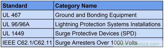 美國保險商實驗室(Underwriter’s Laboratory)所列的數種避雷防護標準主要針對浪湧保護中采用的設備(見表2)。其中,浪湧保護器件標準UL1449規定了瞬態電壓電氣路徑在各種係統供電方式下所需采取的保護模式。