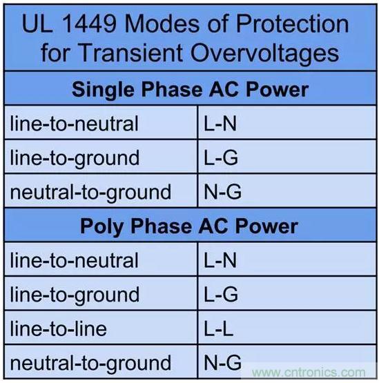 終端設備的供電一般采用單相或多相交流電。當設備連於單條火線和零線(本地地線)之間時,即為單相交流供電。三相係統需要連接三條相線及零線。如表3所示,對於所有的導電路徑組合,隻要其可能發生電勢差,即需在該組合的路徑之間設置浪湧保護。產品說明書中經常以相零(L-N)保護、相地(L-G)保護及相相(L-L)保護等詞描述浪湧保護器件的保護模式。此外,保護模式還可描述為共模或差模浪湧保護。