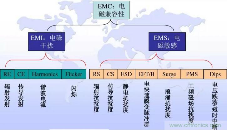電磁兼容性(EMC)是指設備或係統在電磁環境中符合要求運行並不對其環境中的任何設備產生無法忍受的電磁幹擾能力,電磁兼容(EMC)包含電磁幹擾(EMI)和電磁抗擾度(EMS)。其包含的測試項目如圖1所示。