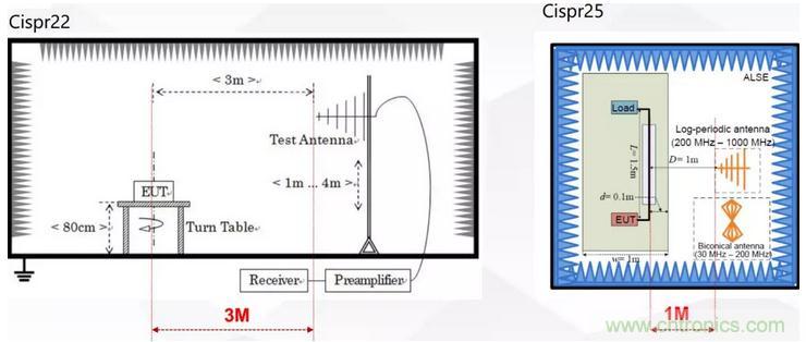 如圖3所示電磁幹擾的輻射測試普遍采用天線接收法測試,相比於CISPR22來說CISPR25額外增加了150KHz ~ 30MHz的輻射測試,這部分測試頻段覆蓋了DCDC的工作頻率範圍,是輻射測試的難點。另外CISPR-25輻射測試采用1M法天線距離更近,測試接收的信號更強。