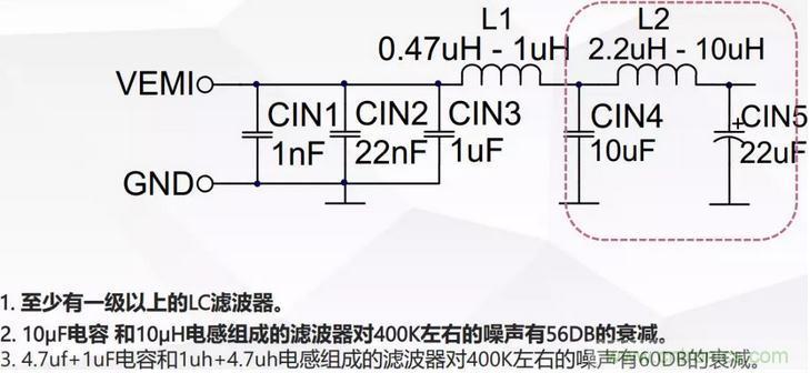 所有的LC濾波器都是以電感結束,並且要遠離DCDC的高頻環路。防止電流環路的近場磁場效應對輸入濾波器的影響。