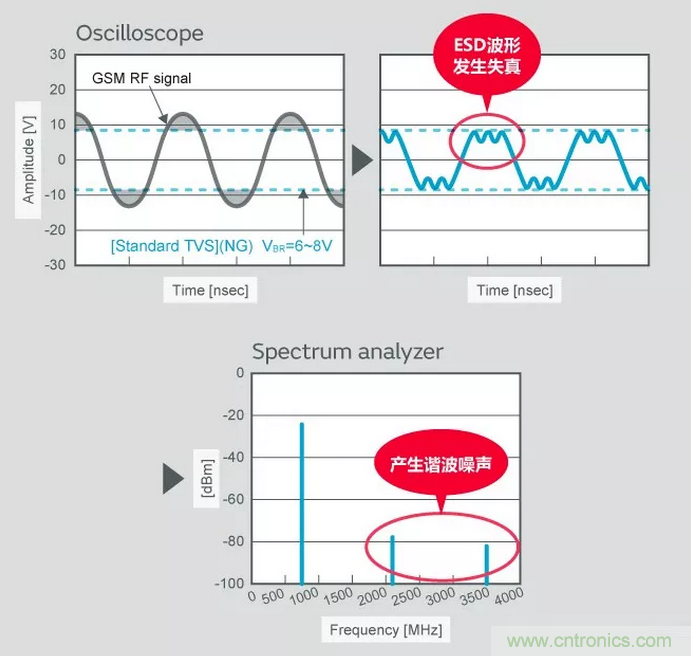 一般使用TVS的場合,即使信號振幅超過TVS的擊穿電壓(VBR)的一瞬間,信號波形也會失真。因此,信號頻率外諧波噪聲發生,受其他信號幹擾,都會導致天線的接收靈敏度降低。
