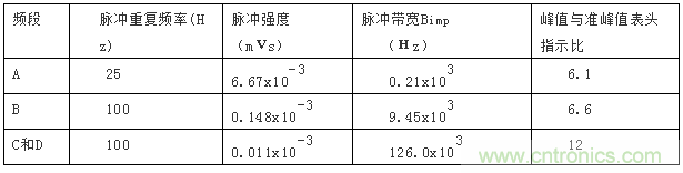 峰值測量時的絕對脈衝特性的含義和準峰值測量是相同的,隻不過輸入的標準脈衝強度不同,標準規定為脈衝幅度×寬度=1.4/Bimp(mVs), Bimp單位為Hz ,具體數值見表6。對於標準脈衝輸入,測量儀在該頻段上的任何頻率上的測量結果均應該等於60dB(μV)。