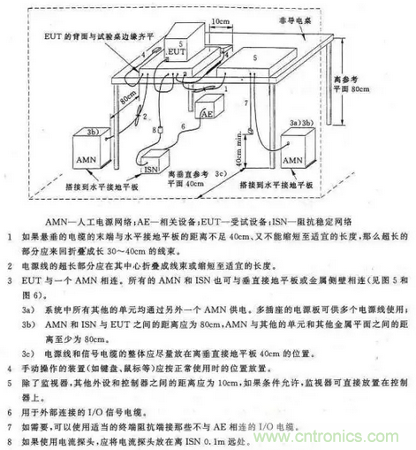 僅是EUT發射的,不會有電網的騷擾混入。另一作用是為測量提供一個穩定的阻抗,因為電網的阻抗是不確定的,阻抗不一樣EUT的騷擾電壓值也不相同,所以要規定一個統一的阻抗,通常為50Ω。AMN實際上是個雙向低通濾波器,電網中的騷擾由50μH和1.0μF的濾波器濾掉,不能進人騷擾測量儀,而EUT發射的騷擾由於50μH濾波器的阻擋不能進人電網,隻能通過0.1μF電容進入騷擾測量儀。測量儀的輸入阻抗是50Ω,所以EUT騷擾的負載阻抗約等於50Ω。對於50Hz的工頻電源,仍然可以通過AMN向EUT供電。圖15中的AMN僅是一種基本結構,由基本結構可以組成V型AMN,用於測量電源中相線—地線和零線—地線的不對稱騷擾電壓,見圖16。也可組成Δ型AMN,除了測量線-地間的不對稱騷擾電壓外還可以測量相線—零線間的對稱騷擾電壓,見圖17。測量時EUT和AMN的布置、連接線的長度和走向等都應按標準規定的要求進行。AMN外殼要良好接地,否則將影響電網和EUT之間的隔離。圖18為台式設備的傳導騷擾測量布置圖。