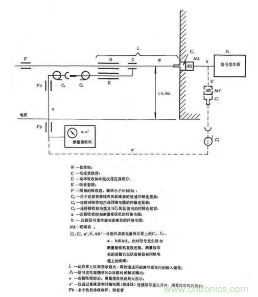 其中C是電流探頭,包括鐵氧體環和探測線圈,作用是測量電源線上的騷擾共模電流。D是鐵氧體環組,作為騷擾共模電流的穩定負載,吸收騷擾功率,並用於隔離EUT和電網。如果在50MHz以下鐵氧體環組D不能充分起到射頻隔離作用,則應在電網端再加一個輔助吸收鉗F,它也是由鐵氧體環組成。E也是鐵氧體環組,用於吸收外場在電流探頭引出電纜上產生的共模電流,以免影響測量結果。測量布置如圖19(b)所示,測試應在屏蔽室內進行,電源線長度應大於6m,即大於30MHzdebanbochangjiashangxishouqiandechangdu。duiyumeiyigeceshipinlvdian,xishouqiandouyingyanzhedianyuanxianyidong,zhaochuzuidazhi,yinweigongmodianliuzaidaoxianshangshiyizhuboxingshichuxiande。gonglvxishouqianceliangxitongyingshiqianjinxingxiaozhun,dedaoxiuzhengyinzi—頻率曲線。校準布置如圖20所示。