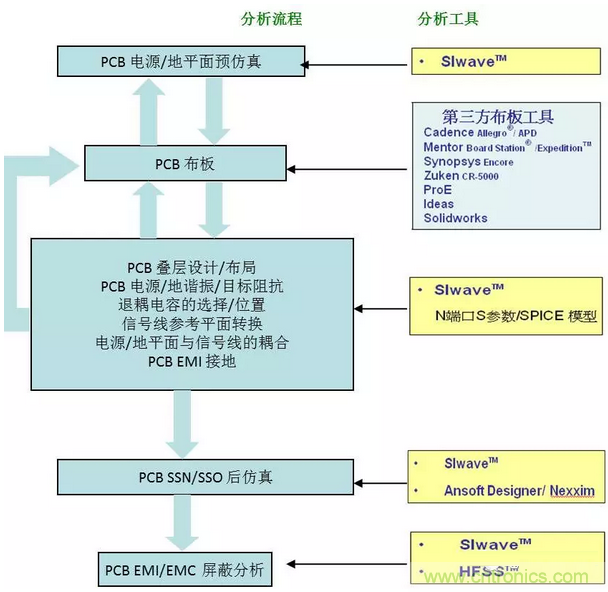 國內外眾多成功經驗證明,電子產品的SI/PI,EMI/EMC仿真和高速通道性能仿真,需要進行兩方麵的仿真——即電磁場仿真和電路仿真。電磁場仿真主要是研究結構對係統SI/PI ,EMI/EMC以及高速串行通道的影響,根據機構的物理特性(幾何結構和材料特性),通過電磁場計算,提取PCB、連接器、線纜等的寄生效應,生成S參數或Spice等(deng)效(xiao)電(dian)路(lu)模(mo)型(xing),或(huo)者(zhe)直(zhi)接(jie)得(de)到(dao)結(jie)構(gou)的(de)輻(fu)射(she)特(te)性(xing)和(he)串(chuan)擾(rao)特(te)性(xing),用(yong)於(yu)設(she)計(ji)指(zhi)導(dao)和(he)性(xing)能(neng)改(gai)進(jin)。在(zai)電(dian)磁(ci)場(chang)仿(fang)真(zhen)的(de)同(tong)時(shi),電(dian)路(lu)仿(fang)真(zhen)也(ye)是(shi)必(bi)不(bu)可(ke)少(shao)的(de)。一(yi)方(fang)麵(mian),電(dian)路(lu)仿(fang)真(zhen)工(gong)具(ju)能(neng)夠(gou)將(jiang)非(fei)線(xian)性(xing)器(qi)件(jian)和(he)電(dian)磁(ci)場(chang)仿(fang)真(zhen)得(de)到(dao)的(de)結(jie)構(gou)等(deng)效(xiao)電(dian)路(lu)結(jie)合(he)到(dao)一(yi)起(qi),通(tong)過(guo)仿(fang)真(zhen)得(de)到(dao)信(xin)號(hao)的(de)波(bo)形(xing)和(he)頻(pin)譜(pu),包(bao)括(kuo)時(shi)鍾(zhong)線(xian)、數據線和電源/地平麵的波形、串行通道的眼圖和浴盆曲線等,直觀地考察係統的SI/PI和傳導EMI特性。 另一方麵,對於輻射幹擾來說,EMI輻射的強度不僅與結構相關(通過電磁場仿真進行研究),還與參與輻射的信號頻譜強度相關,頻譜強度必須通過電路仿真才能得到。