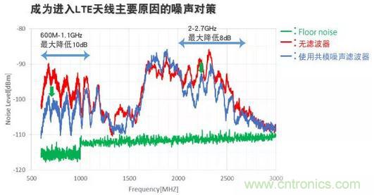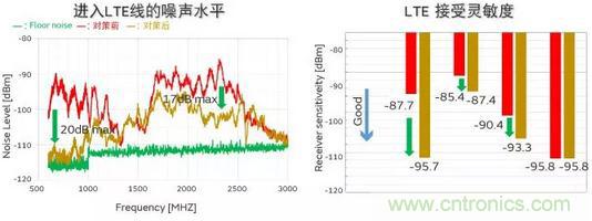 通過這些對策,如圖8所示,天線中進入的噪聲最大可降低20dB,LTE的接收靈敏度取決於頻帶,改善了8dB。