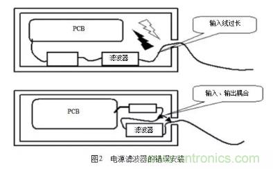 主要考慮(1)抑製工作頻帶以外的幹擾;(2)在信號電路中用吸收濾波器消除無用的頻譜成分;(3)在電源電路(尤其是開關電源中),操(cao)縱(zong)電(dian)路(lu),控(kong)製(zhi)電(dian)路(lu),以(yi)及(ji)轉(zhuan)換(huan)電(dian)路(lu)中(zhong)消(xiao)除(chu)產(chan)生(sheng)的(de)幹(gan)擾(rao)。在(zai)工(gong)程(cheng)實(shi)際(ji)中(zhong),一(yi)個(ge)最(zui)值(zhi)得(de)注(zhu)意(yi)的(de)地(di)方(fang)是(shi)電(dian)源(yuan)濾(lv)波(bo)器(qi)的(de)安(an)裝(zhuang),常(chang)見(jian)的(de)濾(lv)波(bo)器(qi)的(de)錯(cuo)誤(wu)安(an)裝(zhuang)如(ru)圖(tu)2所示。