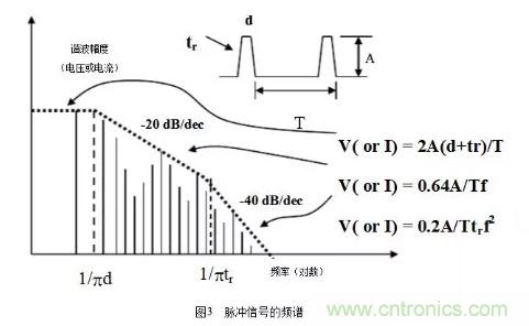 在EMCzhong,chulejibenpinlvwai,haixukaolvxieboyinsu,tongchangqushibeipin,danzaishuzidianluzhongqueyouxiebutong,biruzaishizhongdianluheluojimendianluzhong,fushedaikuanyushuzixinhaodeshangshengyanhuoxiajiangyanyouguanxi,erbushishuzixinhaodezhongfuzhouqi,qiguanxiwei:rtF?/1max?,其中rt是脈衝的上升沿時間。例如,典型時鍾驅動的邊沿速率是2ns,此時,maxF≈160MHz,再考慮十倍頻,則此時鍾電路可能產生直到1.6GHz的de輻fu射she帶dai寬kuan。所suo以yi在zai選xuan擇ze器qi件jian時shi要yao選xuan擇ze慢man速su的de邏luo輯ji器qi件jian係xi列lie,因yin為wei器qi件jian對dui電dian磁ci輻fu射she貢gong獻xian的de大da小xiao與yu工gong作zuo頻pin率lv無wu直zhi接jie關guan係xi而er隻zhi取qu決jue於yu邊bian沿yan速su率lv(這和從電路功能設計上選擇快速器件是矛盾的,在電路設計時需要折中考慮)。還有從器件的抗擾能力上來說,CMOS器件是最好的,因為它的噪聲容限高。從封裝上來說,BGA是最好的,因為它的引線很短。脈衝信號的頻譜如圖3所示。