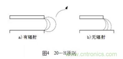 (1)20-H原則,決定印製線條間的距離,表述如下:所有的具有一定電壓的PCB都會向空間輻射電磁能量(如圖4a),為減小這個效應,PCB的物理尺寸都應該比最靠近的接地板的物理尺寸小20H(其中H是兩層PCB的間距),即3mm左右,這樣可使輻射強度下降70%(如圖4b)。20-H原則示意圖如圖4所示:
