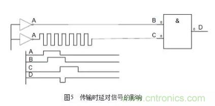 (3)保證信號在PCB上可靠的傳輸,確保信號的完整性。這裏麵主要的問題一般包括時延、阻抗不匹配、地彈跳、串chuan音yin等deng。這zhe不bu但dan影ying響xiang到dao電dian子zi器qi件jian的de穩wen定ding工gong作zuo,還hai會hui產chan生sheng電dian磁ci幹gan擾rao。一yi般ban在zai高gao速su邏luo輯ji設she計ji中zhong最zui容rong易yi碰peng到dao時shi延yan問wen題ti,處chu理li不bu好hao會hui產chan生sheng不bu希xi望wang的de脈mai衝chong幹gan擾rao。傳chuan輸shu時shi延yan對dui信xin號hao的de影ying響xiang如ru圖tu5所示。