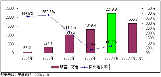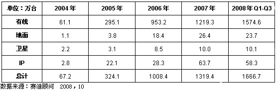 進入2008年nian,中zhong國guo數shu字zi電dian視shi產chan業ye特te別bie是shi有you線xian數shu字zi電dian視shi產chan業ye保bao持chi了le快kuai速su發fa展zhan的de勢shi頭tou,數shu字zi電dian視shi機ji頂ding盒he市shi場chang與yu數shu字zi電dian視shi整zheng體ti轉zhuan換huan同tong步bu發fa展zhan,市shi場chang規gui模mo不bu斷duan增zeng長chang。2008年前三季度中國機頂盒市場銷量迎來井噴,賽迪顧問的調研數據顯示,前三季度中國市場共銷售機頂盒1666.7萬台,同比增長了83.4%。