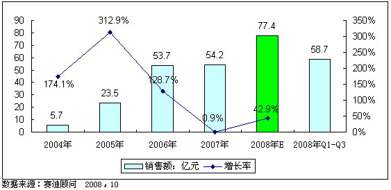 圖2 2004-2008年中國數字電視機頂盒市場銷售額及預測