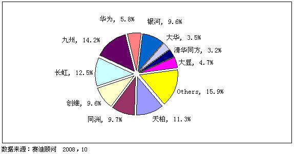 在品牌市場方麵,九洲在2008年全麵發力,國內國際市場雙豐收;長虹繼續有穩定的表現,以12.5%的份額位居品牌排名第二位;天柏和同洲銷量也持續增加,分別位於市場第三和第四位,銷售量市場占有率為11.3%和9.7%。值得一提的是,隨著市場銷量的暴漲,除TOP10之外,其它品牌也有了較好的表現,市場份額有了較大的提高。相比2007nian,qianshimingqiyedeshichangjizhongduchuxianlexiahua,jiuqiyuanyin,zhuyaoshiyinweishichangzengchanghenkuai,zhuliuqiyedeshengchanguimoheyingxianglinanyimanzuquanbuxinzengshichangdexuqiu,bushaodifangxingdexiaoqiyeqiangzhanshichangsuozhi。