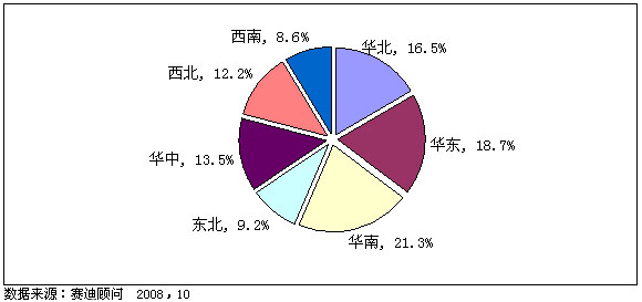 圖4 2008年前三季度中國數字電視機頂盒區域市場銷量結構