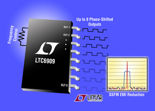 淩力爾特公司 (Linear Technology Corporation) 推出精確矽振蕩器LTC6909,該器件極大地降低了峰值輻射 EMI,並在多相電源中改善了開關穩壓器的控製。LTC6909 有 8 個獨立輸出,提供多達 8 個軌至軌 50% 占空比時鍾信號。這些輸出可以用來啟動或禁止以及實現多個開關穩壓器的相位同步。相位同步提供多種設計優勢,包括改善的 EMI 性能、降低的輸入和輸出紋波電流、以及更好的負載瞬態響應。使用 3 個邏輯輸入,這些輸出之間的相位關係可以從 45o 至 120o 配置,或者輸出可以被置於邏輯低或高 Z 狀態。
