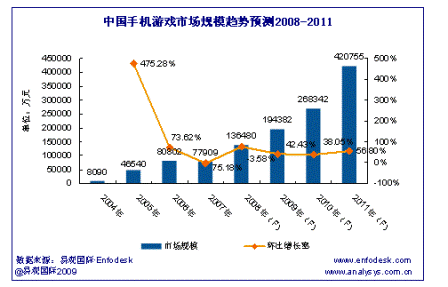 據易觀國際(Analysys International)最新報告《中國手機遊戲市場趨勢預測2008-2011》研究結果顯示:2011年中國手機遊戲(本文手機遊戲範疇均為基於JAVA和BREW技術開發的手機遊戲)市場規模將達到42億元,從2003年到2011年的手機遊戲市場規模年均複合增長率為147.90%。其中移動運營商收入從2003年到2011年年均複合增長率將達143.26%,手機遊戲SP收入從2003年到2011年年均複合增長率將達348.01%。手機遊戲SP高複合增長率主要由自身對手機聯網遊戲產品的推動、用戶對休閑娛樂應用需求的增長、3G網絡商用等因素所帶動。