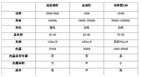 表 功率型LED與傳統道路照明光源的比較