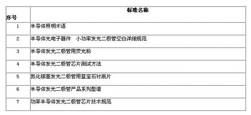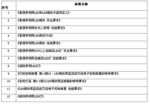 標準的目的在於加強生產的一致性、提升質量、並增進生產效率,若欲提升LED的製造質量,在全球化的競爭脫穎而出,標準是一項不可或缺的工具,因此加速對LED標準的製定是各國政府及業界非常重視的問題。2007年在半導體照明標準工作指導委員會的指導下,由“國家半導體照明工程研發及產業聯盟”成立“聯盟標準化協調推進工作組”,以負責協調中國的LED標準進度。而目前最新進展是由“全國照明電器標準化技術委員會”提出的普通照明用LED國家標準及行業標準等10多項標準目前都在送審階段,預計於今年陸續頒布實施,如表所示。