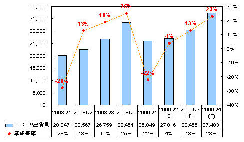拓墣研究員張乘維表示,隨LCD TV需求的逐季增溫,全球LCD TV出貨量預估將從2009年第二季的2,701.6萬台逐季攀升到第四季的3,740.3萬台;由於上半年LCD TV超乎市場預期熱銷,預估下半年LCD TV出貨年成長將稍稍趨緩,縮減至11%~14%。