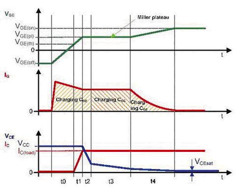 圖2顯示了柵極-發射極電壓VGE、柵極電流IG和相應的集電極電流IC作為時間的函數,從IGBT導通到飽和這段時間的簡化波形。