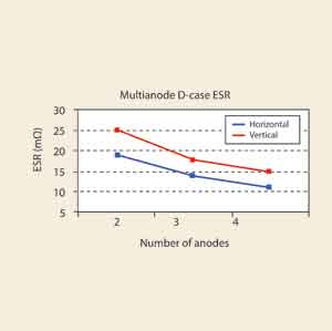 橫向和縱向結構兩者ESR性能之間的差異如圖2所示。這個例子是基於對D類電容器的理論計算,圖2表明,兩陽極橫向結構與三陽極係統的縱向結構的ESR值相似。然而,相對而言橫向結構在ESR上性價比優勢更顯著。