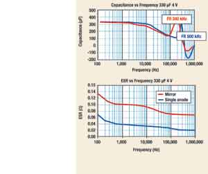 鏡像結構如果使用更薄的陽極,電容將隨頻率下降至更低。鏡像設計的共振頻率改變,其原因是目前一般的DC/DC轉換器其開關頻率的工作範圍(250~500kH)會因降低ESL而顯著升高。
