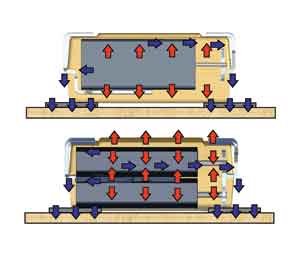 鏡像設計的另一個好處是改善了其散熱性能如圖4所示,紋波電流在陽極產生的熱量通過PCB板上的引線和鉭絲得以發散冷卻。