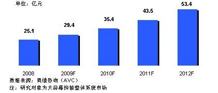 屏幕拚接市場已經進入快速成長期,據奧維谘詢(AVC)《中國大屏幕拚接市場研究報告》顯示,2008年中國市場規模約為25.1億元,2009年雖然遭遇經濟大環境的影響,預計仍將增長17%左右,市場規模將達29.4億元。市場的成長主要得益於國家對能源、交通等基礎建設的大規模投入,以及09年全運會、10年世博會、亞運會等大型賽會事的拉動。