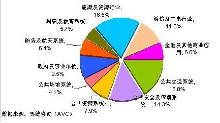大屏幕拚接產品從最開始較為狹窄的專業級、高端的應用(如廣電、電力、電信領域等)已經擴展到今日的覆蓋公共管理、民生、能源、工業、商業、娛樂等幾十個細分應用領域,隻要需要超過100英寸的高品質、持續工作的顯示畫麵的場所,都是大屏幕拚接產品的舞台。奧維谘詢(AVC)大屏幕拚接研究體係中,依據應用特點將數十個細分領域劃分為10大細分行業,2009年上半年各細分行業比重結構如下圖: