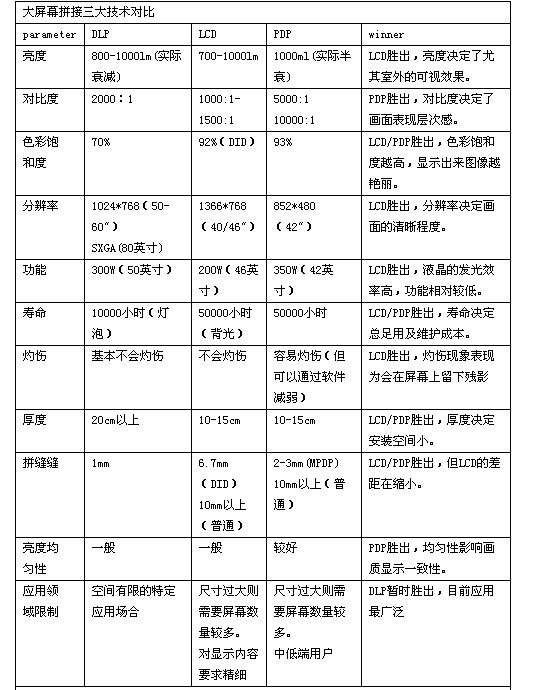 從以下對比表不難發現,從技術層麵來看,LCD技術占有綜合優勢的地位,主要弱勢是拚接縫較寬,而DLP主要優勢則在拚接縫最小,在色彩表現、分辨率、壽命等方麵都有著較為明顯的缺陷。PDP則在防灼傷、分辨率方麵相對較弱。