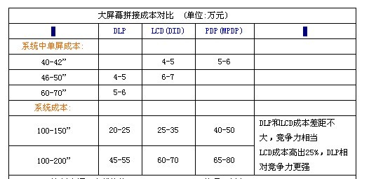 從總體係統分析,100-150”係統中,DLP平均成本為20~25萬元左右,而LCD和DLP的差距已經縮小到10萬元以內,成本競爭力基本相當。在150”以上超大拚接係統中,LCD的成本要高出DLP大約25-30%,而MPDP更是要高出30%以上,這一領域DLP的成本競爭力優勢比較明顯。