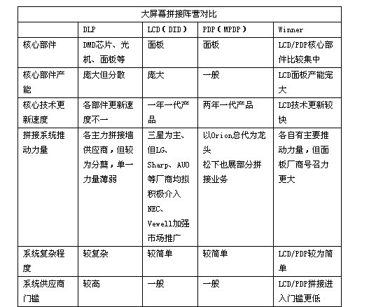 雖然以LCD和PDP為主的FPD技術發展迅速,也開始挑戰DLP的主導地位,但以2009年上半年來看,DLP大屏幕拚接仍然占到整體市場的64%,LCD占到20%,PDP則由於廠商陣營較小,僅占到9%。