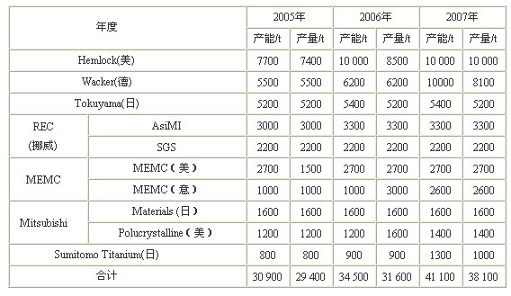 表1 2005-2007年國外矽材料企業的產能和產量情況