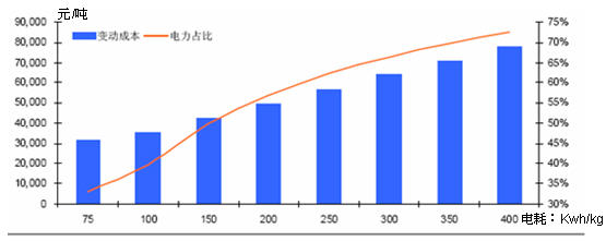 - 國內企業在綜合電耗高的在300kWh/kg以上,電耗低的則在200kWh/kg左右
